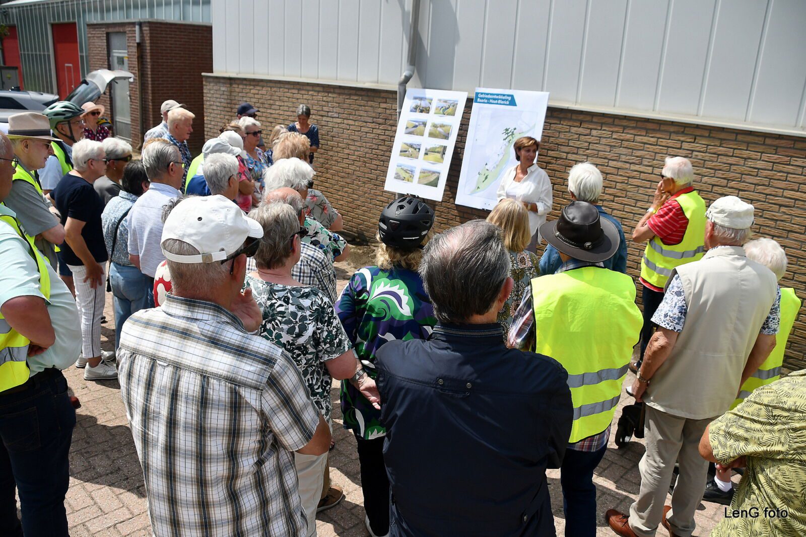Al na ongeveer 2 km was er een eerste (info)stop aan de Hummerenweg. Daar stonden 2 dames van het Waterschap Limburg klaar om informatie te geven over de gebiedsontwikkeling die te maken heeft met de dijkaanpassingen en herinrichting van het gebied langs de Maas ter hoogte van Baarlo. De huidige dijk beschermt de dorpskern Baarlo en het landelijke gebied ten noorden hiervan. Op dit moment is de dijk niet hoog, sterk en stabiel genoeg om Baarlo en Hout-Blerick ook in de toekomst goed te beschermen tegen hoogwater. De dijk moet daarom worden verhoogd, verlegd en er moeten nieuwe dijken worden aangelegd. Met behulp van een aantal foto’s en een plattegrond kregen de deelnemers op deskundige en begrijpelijke wijze uitleg over de plannen om die doelstellingen te realiseren. Na afloop van deze eerste sessie mochten de deelnemers alvast enkele presentjes van het Waterschap uitzoeken en meenemen, die de dames achterin de kofferbak van hun auto hadden uitgestald. Daarmee was het informatieve deel met betrekking tot dit thema overigens nog niet afgerond.