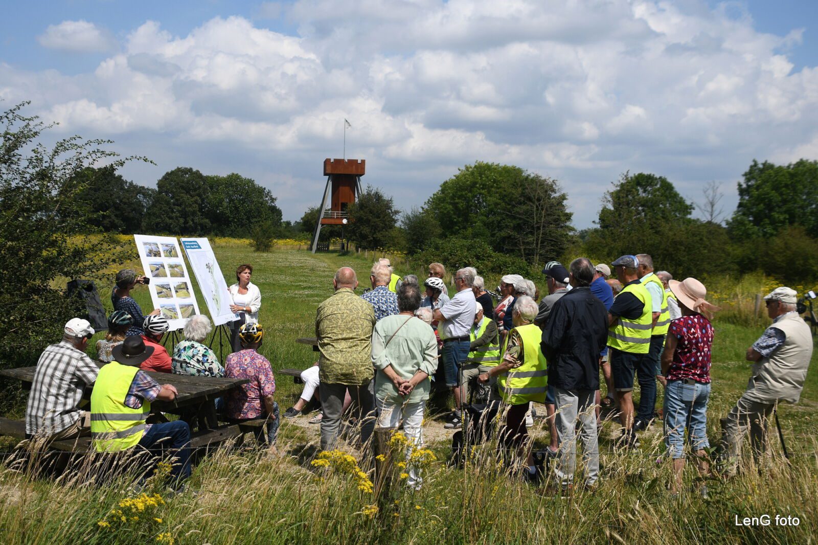 Met een omweg werd vervolgens namelijk koers gezet naar de tweede (info)halte. Ditmaal in de weide bij de “Uitkijktoren” langs de Maas ter hoogte van Kasteel “De Berckt”. Aldaar stonden de dames van het Waterschap Limburg wederom klaar voor de tweede infosessie. Dit keer om wat te vertellen over de (nieuwe) dijk die langs Kasteel De Berckt en over het golfterrein richting Hout-Blerick is gepland, alsmede over de gebiedsontwikkeling ter plekke. Opnieuw werd er aandachtig geluisterd en werden ook vragen op begrijpelijke wijze en tot tevredenheid van de deelnemers beantwoord. Als afsluiting van dit informatieve gedeelte bedankte Ton Peulen namens de KBO Baarlo én de Fietscommissie de dames van het Waterschap voor de presentatie en deskundige uitleg.