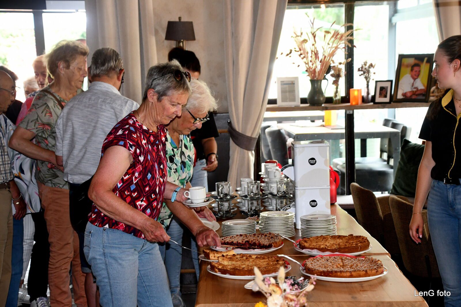 De tocht werd daarna wederom met een omtrekkende beweging en ditmaal zonder verdere onderbrekingen voortgezet via Hout-Blerick, De Boekend, het Rooth naar Eetcafé De Elze aan de Baarlosestraat in Hout-Blerick. Daar werden de deelnemende leden op het terras door de vereniging getrakteerd op koffie/thee en een stuk vlaai. Nadat de penningmeester namens de KBO afgerekend had, was het nog maar een kleine 5 km om de geslaagde tocht op de Markt af te sluiten.