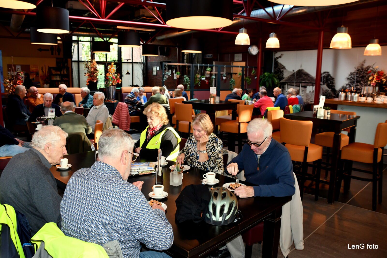 Na de middagpauze werd er eerst op het voetbalveld nog een groepsfoto gemaakt en werd daarna via het bos in het Leudal en Nunhem koers gezet naar Neer. Langs de Maas richting Kessel-Eik werd er nog even halt gehouden en genoten van het mooie panoramazicht over de Maas bij de ‘Musschenberg’. Dit opdat we – conform de vooraf gemaakte afspraak – niet te vroeg bij de laatste pauzeplaats in Kessel, Café de Boesjer, zouden aankomen. Aldaar gearriveerd konden we met z’n allen op het terras buiten zitten waar de uitbaters Jones en Carly de tafeltjes speciaal voor ons gereserveerd hadden. Daar werd nog wat gezellig nagebabbeld onder genot van een consumptie. Uiteindelijk fietste iedereen weer richting Baarlo en konden we terugkijken op een geslaagde en plezierige fietstocht.