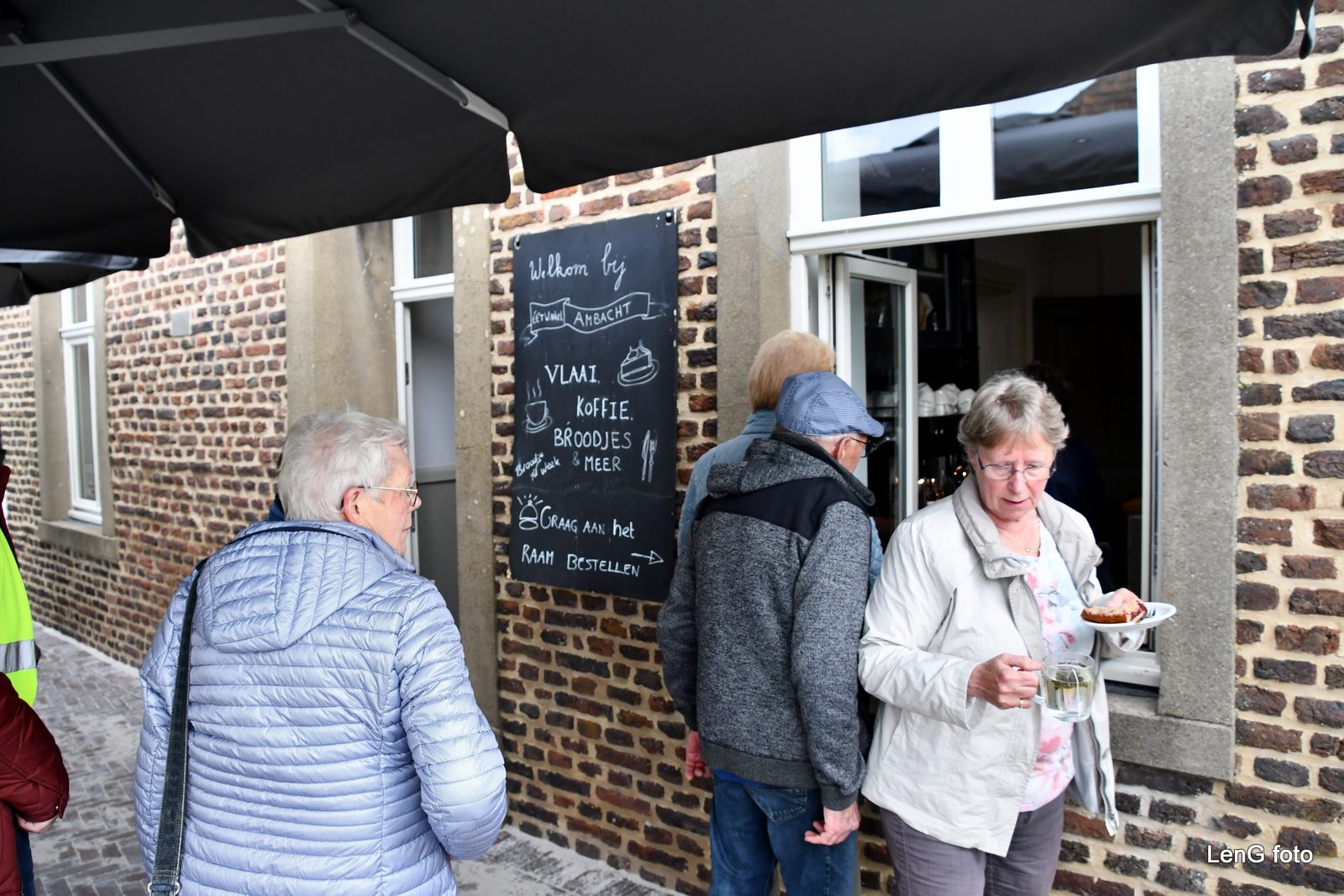 Verdeeld in drie groepen ging het via het buurtschap Oyen richting Kessel en via de Musschenberg in Kessel-Eik richting Neer. Aldaar was het genieten van het panoramische uitzicht op de Maas. Niet veel later arriveerden we bij onze eerste rustplaats: de watermolen in Neer. Deze unieke 700 jaar oude Friedesse molen is onlangs helemaal gerenoveerd en er is een mooi terras aangelegd. Namens de KBO werd er koffie met vlaai aangeboden en daar hebben we allemaal van kunnen genieten.