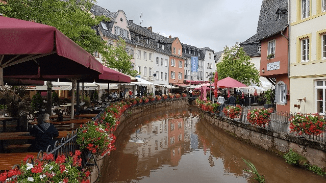 Al vroeg in de morgen was de reiscommissie samen met de chauffeur bezig om het programma van vandaag, i.v.m. de in de namiddag verwachte regen aan te passen. Om 10.00 u vertrokken wij naar Saarburg voor een rondleiding met gids. De stad Saarburg, ca. 7.500 inwoners, ligt in de deelstaat Rijnland-Palts. Omdat er twee gidsen waren, een Duitssprekende en een Nederlandssprekende, werd ons gezelschap in twee groepen verdeeld. De Leukbach in het historische centrum van Saarburg. De reiscommissie had werkelijk aan alles gedacht. Vandaag kreeg iedereen een envelop met “zakgeld” om op eigen gelegenheid in een van de vele horecagelegenheden van Saarburg te gaan lunchen. Na de lunch vertrokken wij naar het Saarland Museum, Modern Galary in Saarbrücken. Saarbrücken telt ca. 180.000 inwoners en ligt aan de Saar. In het museum zijn werken te zien vanaf de 19e eeuw tot nu. De collectie bestaat uit expressionistische en informele kunst. Het museum was een perfecte schuilplaats voor de regen die royaal uit de hemel kwam. Tot onze verrassing bleek het museum ook nog eens op de dinsdagen van 15.00 tot 18.30 u gratis toegankelijk. Na het avondeten werd er gekaart. Het merendeel van de overige leden van de groep zat gezellig samen of “vergaderde” in een van de lokalen van hotel Roemer.