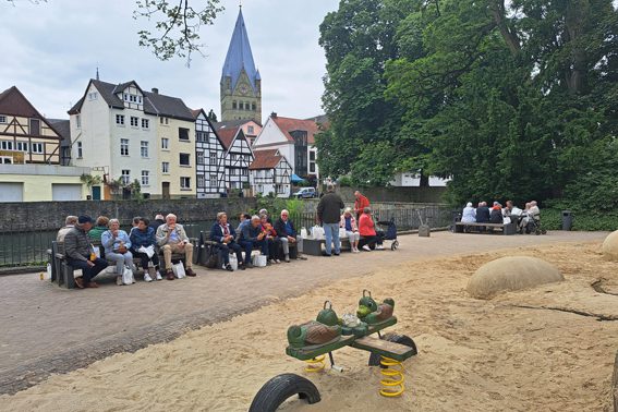 Via de Duitse A 40 en A 44 reden we naar Soest. Roland gaf in de bus wat informatie over Soest waar we rond 12.00 uur aankwamen om het lunchpakketje dat John Habets voor ons gemaakt had in een prachtig park op te eten. Omdat er nog tijd over was voordat de gidsen zouden komen gingen groepjes de stad in om al wat van Soest te zien. Anderen bleven op een terras zitten en maakten gebruik van een toilet.Om 13.30 uur stonden 2 stadsgidsen klaar om ons een en ander te laten zien en ze vertelden over de geschiedenis van Soest. De Dom werd bezocht en we wandelden langs de stadswallen van de stad waar een kerk, die met de groenachtige zandsteen gebouwd en nu gerestaureerd werd slechts aan de buitenkant kon worden bekeken. De ene groep had een Nederlandse gids en de andere moest het met een Duitse doen. Na de stadswandeling vertrok de bus voor een rit van 260 km langs Hannover naar het Hotel in Bispingen. Om beurten zorgden Roland en Dan de hele reis voor de warme en koude drank en deelde Will koekjes uit. Onderweg gaf Bert wat informatie over het hotel en kwam Will regelmatig met de snoepjestrommel rond.