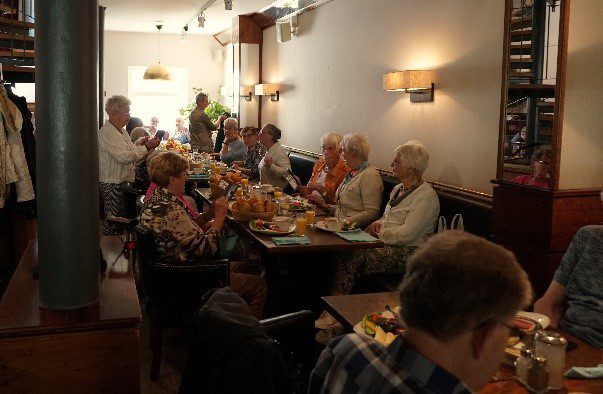 Hierna mochten we weer plaatsnemen in de bus en kregen we een schitterende rondrit langs mooie villa’s, prachtige gebouwen, parken en waterpartijen in deze schone miljoenenstad. Onze chauffeur Dan kreeg van de gids complimenten omdat hij de bus zo geweldig door het drukke verkeer loodste. Om 13.00 uur was de rondrit afgelopen en reed de bus naar de ‘Hauptbahnhof’. Met behulp van de roltrap verplaatsten we ons naar restaurant ‘Schweinske’ waar de tafels gedekt waren en de lunch al gedeeltelijk klaar stond.