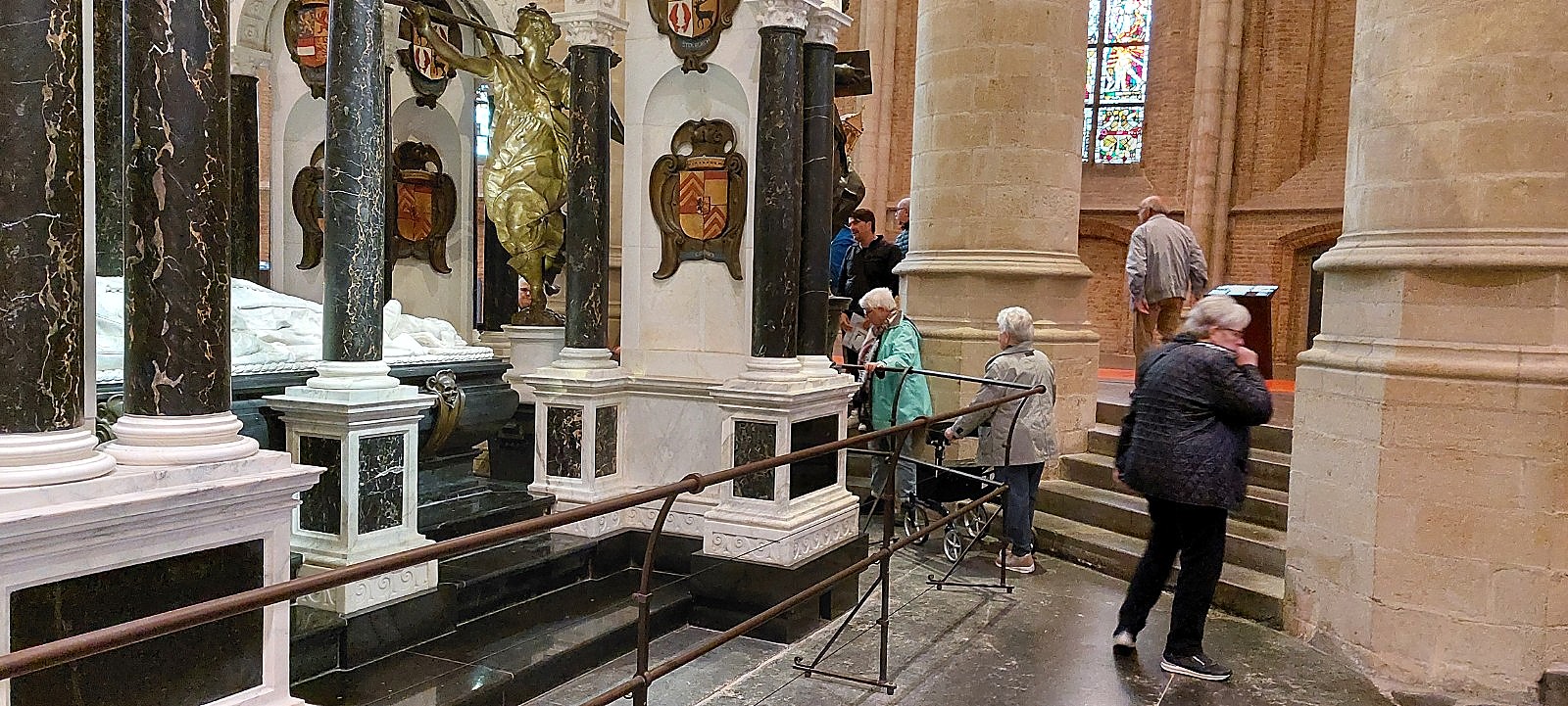 Via een korte looproute werd richting de Nieuwe Kerk gewandeld waar inmiddels 3 gidsen gereed stonden om ons in drie groepen wegwijs te maken in deze schitterende kerk. Met name de uitleg over de onder het praalgraf van Willem van Oranje liggende grafkelders met tot nu toe 19 overleden Koninklijke Oranjes maakte veel indruk. Na deze kerkvisite ging het via een wandelroute, in een lange KBO sliert, naar lunch restaurant Het Karrewiel waar men kon genieten van een super goed verzorgde stevige lunch waar niemand iets te kort hoefde te komen.